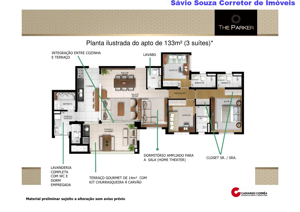 Planta opção de 134m2 - 4 dts, 02 suítes.- Home Theater - Lavabo- Sala de Almoço - Sala de Estar - Terraço.